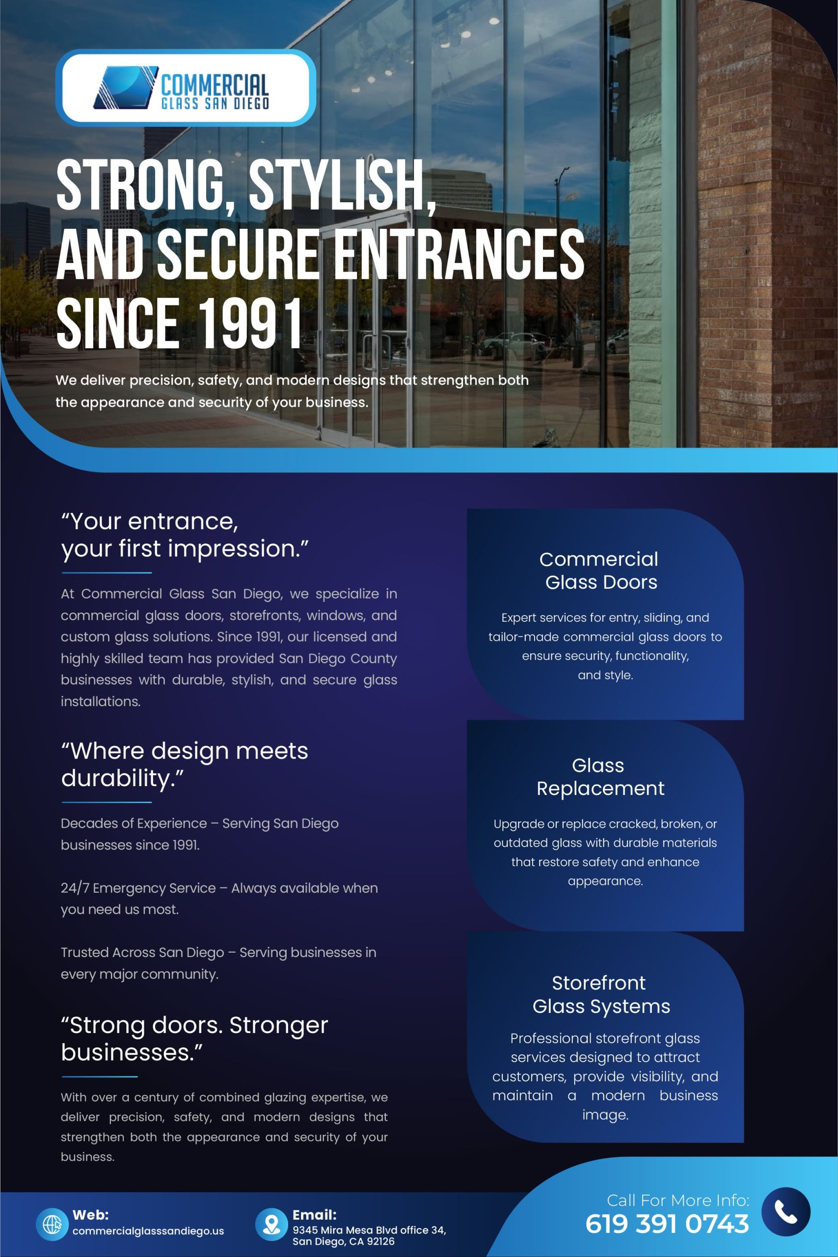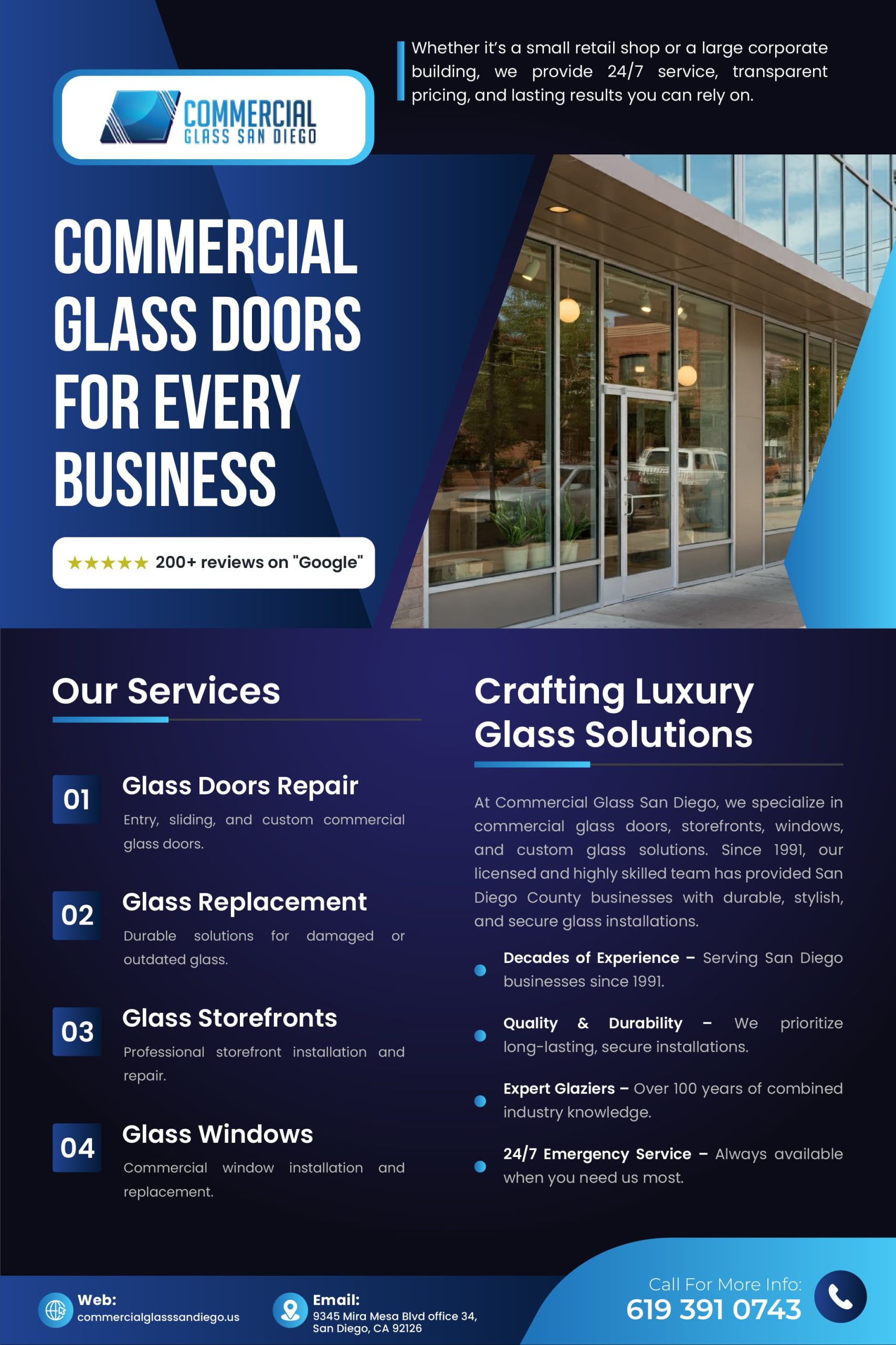 Your entrance is key. Commercial Glass Doors make a statement. They invite customers in. Commercial Glass San Diego understands their importance. We've served San Diego County since 1991. Our team boasts over 100 years of combined glazing experience. This ensures expert installation. We handle all sizes of projects. From small retail entries to grand corporate doors, we deliver.